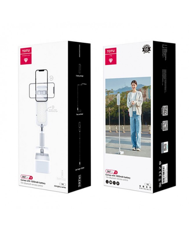 این پایه برند توتو دارای یک باتری 1000 میلی آمپر ساعتی برای تعمین انرژی مورد نیاز لامپ موجود بر روی آن است ، که برای ایجاد روشنایی در مکان های تاریک بر روی این محصول تعبیه شده و علاوه بر این یک ریموت کنترل بلوتوثی برای مدیریت بر روی نور(100 عدد لامپ که دارای 7 نوع مختلف با اثر نوری گرم ، سرد ، نور دو رنگ ، نور سه بعدی هست ) ، شاتر و خاموش/روشن کردن وجود دارد که هر دو آنها با کمک پورت Mircro USB و کابل موجود در بسته بندی شارژ می شوند و با یکبار شارژ به طور کامل برای مدت زمان 4 تا 12 ساعت پلی تایم ارائه کند.در آخر هم باید توجه داشته باشید که قسمت تلسکوپی V6 دو تیکه بود و قابلیت جابجایی در جهات مختلف را در کنار قسمت سری با ویژگی چرخش 360 درجه داراست.