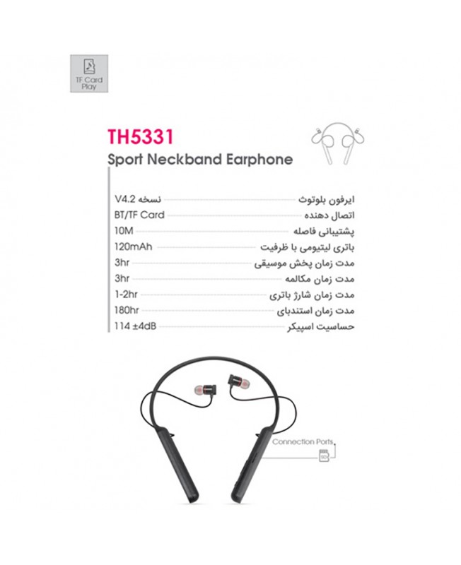 هدفون دور گردنی تسکو مدل TH5331 که توانایی پخش موسیقی و انجام مکالمه برای مدت زمان 3 ساعت را داراست و به دلیل بهره مندی از تکنولوژی بلوتوث ورژن 4.2 این امکان را فراهم می کند تا کاربران بتوانند با آن به صورت بی سیم متصل شوند.