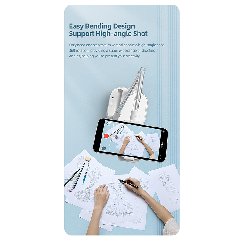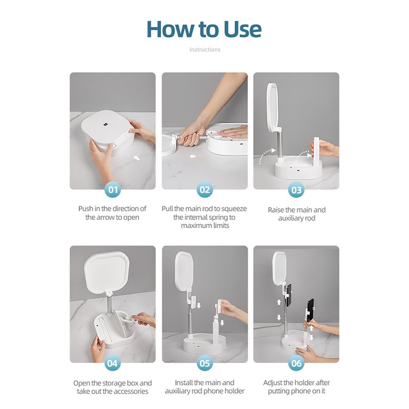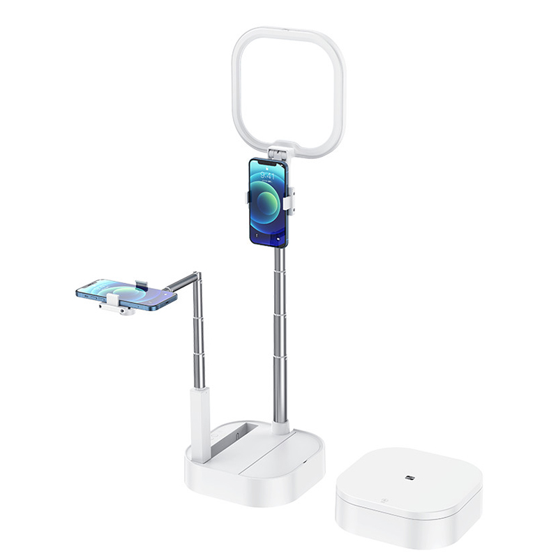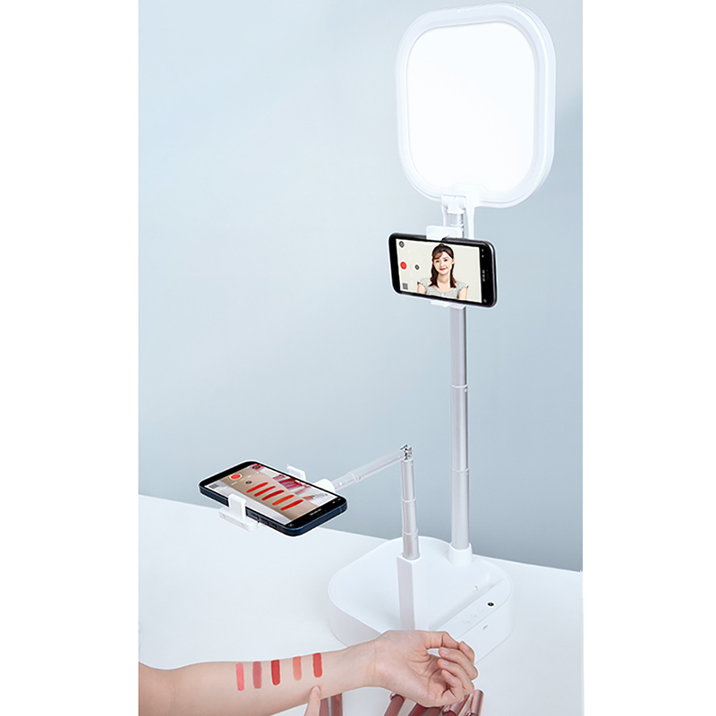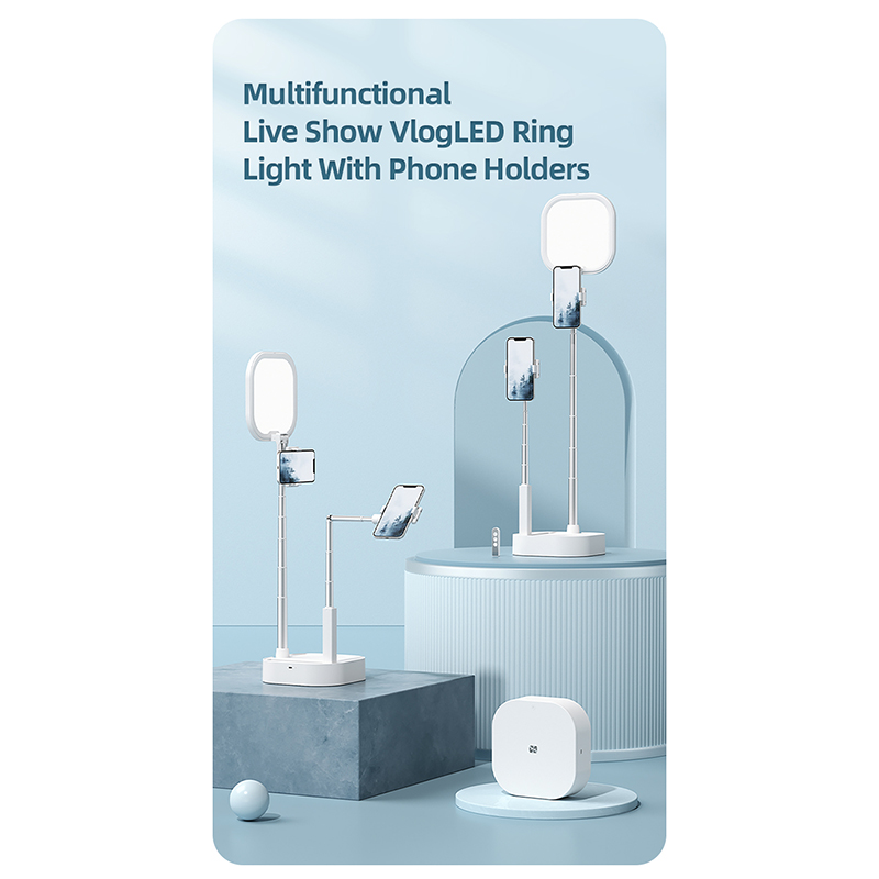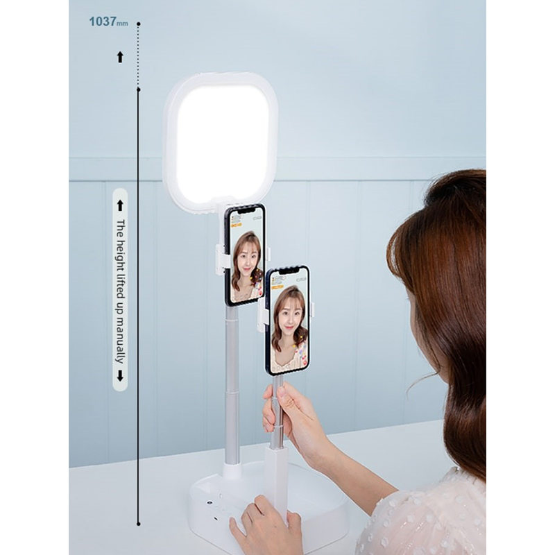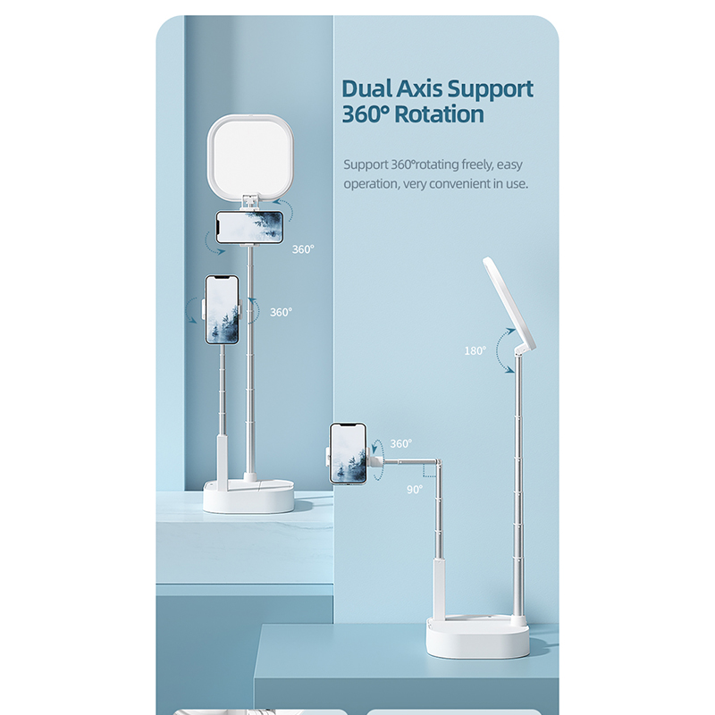 Multifunctional LED Ring Light دارای توانایی چرخش 360 درجه است که به این معناست که می توانید به صورت افقی و عمودی از گوشی استفاده کنید هم چنین دارای دو پایه برای نگهداری همزمان دو گوشی موبایل است که اندازه ارتفاع این پایه ها قابل تنظیم است. این محصول برای نگهداری گوشی هایی با عرض 5 تا 9 سانتی متر قابل استفاده می باشد.