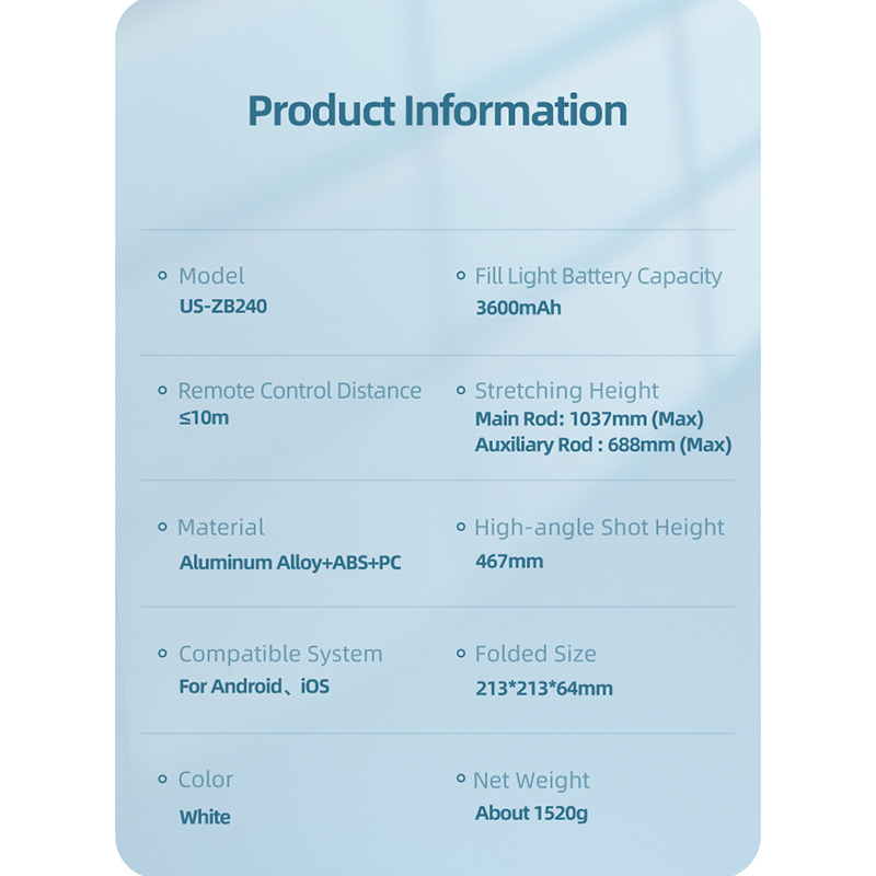 رینگ لایت چند منظوره یوسامز Multifunctional Live Show LED Ring Light US-ZB240 از آلیاز آلومینیوم، ABS و PC ساخته شده است و ابعاد این محصول 1520 گرمی در حالت تا شده 21.3*21.3*6.4 سانتی متر می باشد که در این حالت به سادگی قابل حمل است. این رینگ لایت دارای دو پایه برای نگهداری همزمان دو گوشی موبایل است که ارتفاع هر کدام قابل تنظیم است به این صورت که پایه اول تا حداکثر ارتفاع 103.7 سانتی متر تنظیم می شود و پایه ثانویه دارای حداکثر ارتفاع 68.8 سانتی متر می باشد که این پایه کمکی قابلیت خم شدن هم دارد و ارتفاع حداکثری آن در حالت خم شده 46.7 سانتی متر است. این حلقه نور از 108 قطعه مهرههای چراغ LED تولید شده و نور پردازی با کیفیتی را به کاربران ارائه می دهد. از نکات دیگر راجع به رینگ لایت یوسامز می توان به باتری 3600 میلی آمپر ساعتی آن اشاره کرد که ولتاژ و جریان ورودی 5V/2A است که این امکان را می دهد بعد از شارژ شدن بین 3 تا 12 ساعت به صورت وایرلس از این کالا استفاده کرد.