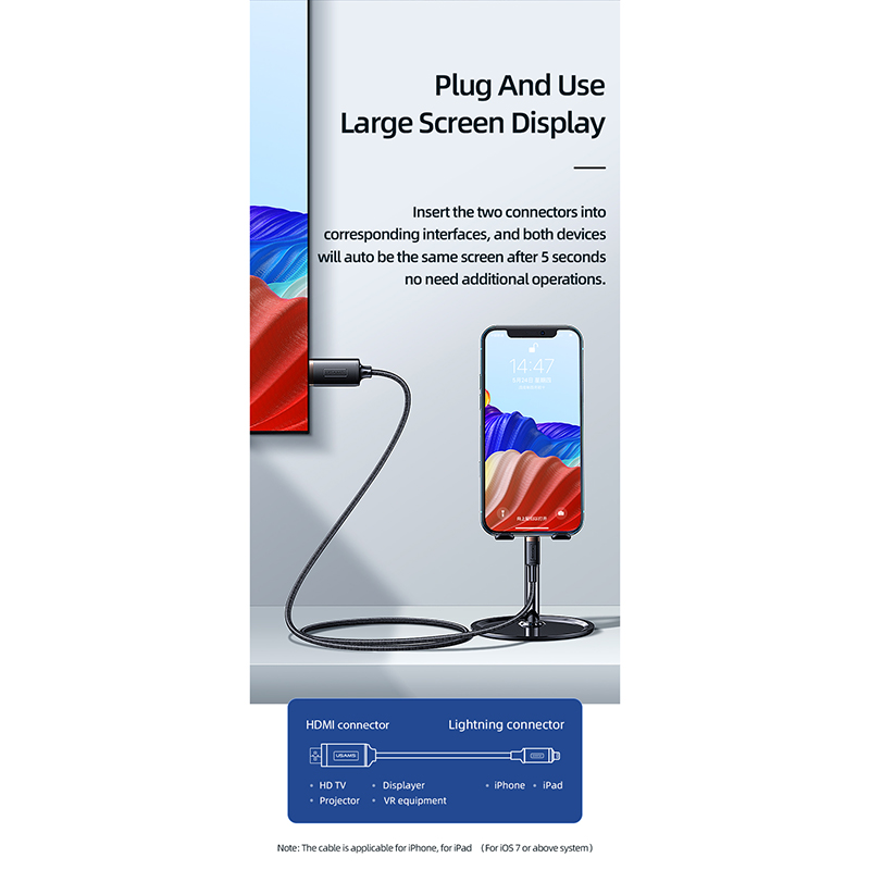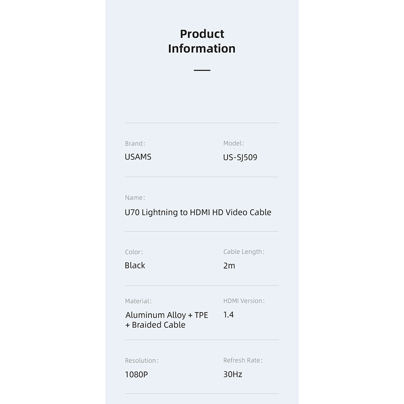 کابل تبدیل Lightning به HDMI یوسمز 2 متری | USAMS US-SJ509 دارای رفرش دیت 30 هرتز بوده و مناسب برای دستگاه های اپل با پورت لایتنینگ و البته سیستم عامل آی او اس 7 به بالا می باشد.