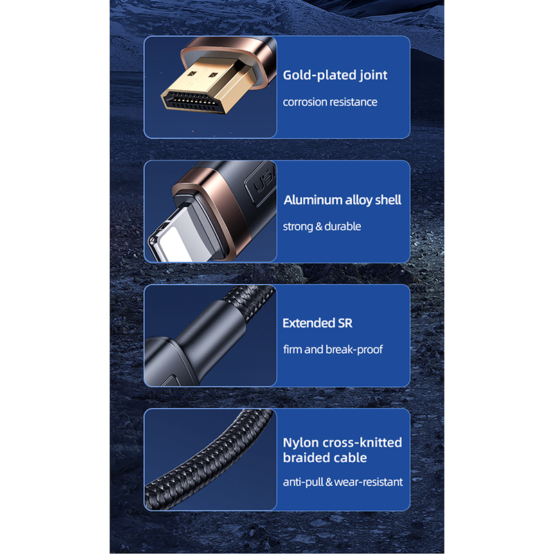 کابل HDMI به لایتنینگ US-SJ509 دارای متراژ 2 متر بوده و تولید شده توسط برند یوسامز که یکی از برند های فعال در زمینه لوازم جانبی می باشد. از نقاط مثبت این کابل می توان به پشتیبانی آن از 3D Stereo Visual Effects ، تصاویر 1080 HD اشاره کرد که به لطف متریال به کار رفته مانند روکش طلای سری های آن می باشد.کابل تبدیل Lightning به HDMI یوسمز 2 متری USAMS US-SJ509 دارای رفرش دیت 30 هرتز بوده و مناسب برای دستگاه های اپل با پورت لایتنینگ و البته سیستم عامل آی او اس 7 به بالا می باشد.