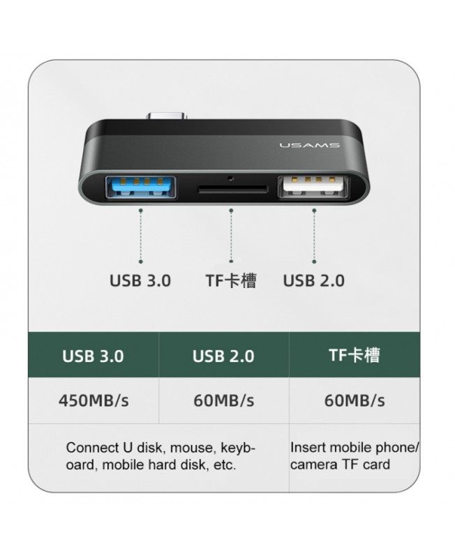 هاب 3 پورت USB-C یوسامز مدل US-SJ463 ، دارای 2 پورت USB و یک شیار TF Card می باشد که پورت USB آن از USB 3.0 پشتیبانی می کند.