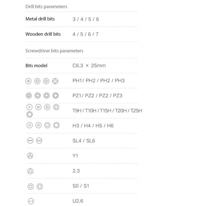 سری ها24 سری مختلف : PH1 , PH2 , PH2 ,PH3 ,H3 ,H4 ,H5 ,H6 ,SL4 ,SL6 ,PZ1 ,PZ2 ,PZ2 ,PZ3 ,T9H ,T10H ,T15H ,T20H ,T25H ,S0 ,S1 ,U2.6 ,Y1 ,2.3 , دو نوع سری متفاوت دریل که هر کدام 4 مدل مختلف دارند: 3.0 ,4.0 ,5.0 ,6.0 و 4.0 ,5.0 ,6.0 ,7.0