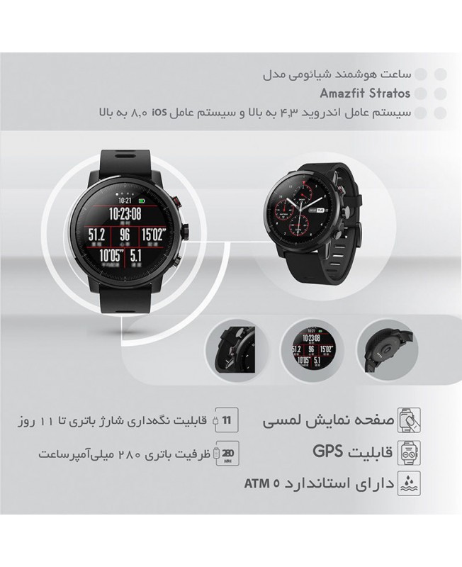 ساعت هوشمند آمازفیت استراتوس ساعتی است در کلاس ورزش که نسبت به قیمتش امکاناتش مناسبی را در اختیار شما قرار می دهد. Stratos Xiaomi Amazfit یک ساعت همه کاره محسوب میشود و از نظر متریال ساخت، مواد به کار رفته با کیفیت و طراحی ظاهری کلاسیک گزینه ی مناسبی برای خرید می باشد، و با نگاهی به ظاهر و امکانات آن به سرعت عاشق آن میشوید.همچنین ساعت هوشمند آمازفیت استراتوس دارای صفحه نمایش از نوع Gorilla glass در ابعاد ۱.۳۴ اینچ در رزولوشن ۳۲۰ در ۳۰۰ و یک سنسور در جلوی ساعت برای تنظیم میزان نور صفحه ال سی دی میباشد و امکاناتی نطیر سیستم عامل اختصاصی، پردازندهای دو هسته ای با فرکانس 1.2 GHz، 4 گیگابایت حافظه داخلی ، 512 مگابایت رم و باتری 290 میلیآمپری که در حالت استفاده از GPS تا ۵ روز و در حالت عادی تا 11 روز مدت استفاده را برای شما فراهم کند. ساعت هوشمند آمازفیت استراتوس نسخه گلوبال دارای اتصالات بیسیم از طریق فناوری بلوتوث نسخه ۴ و وای فای است، که هر دستگاه اندرویدی با اندروید بالاتر از ۴.۴ و هر دستگاه ای او اسی با آیاواس بالاتر از ۹ به راحتی توانایی اتصال به این ساعت هوشمند را دارند.و همچنین ساعت استراتوس دارای سنسور های ضربان قلب نوری، جی پی اس و گلوناس برای موقعیت یابی و یک بارومتر برای سنجش ارتفاع است.