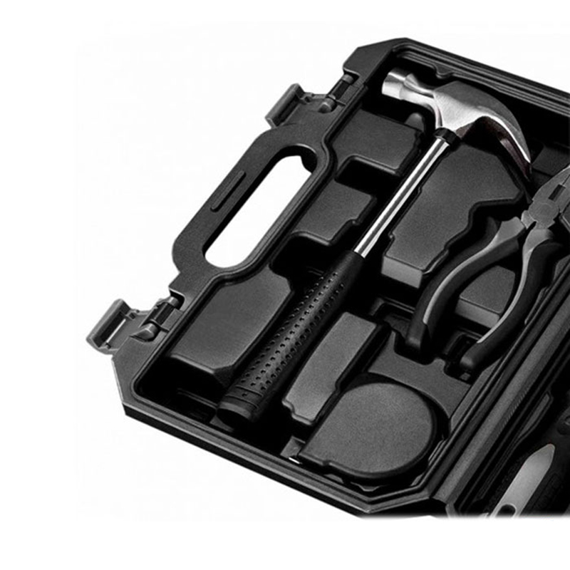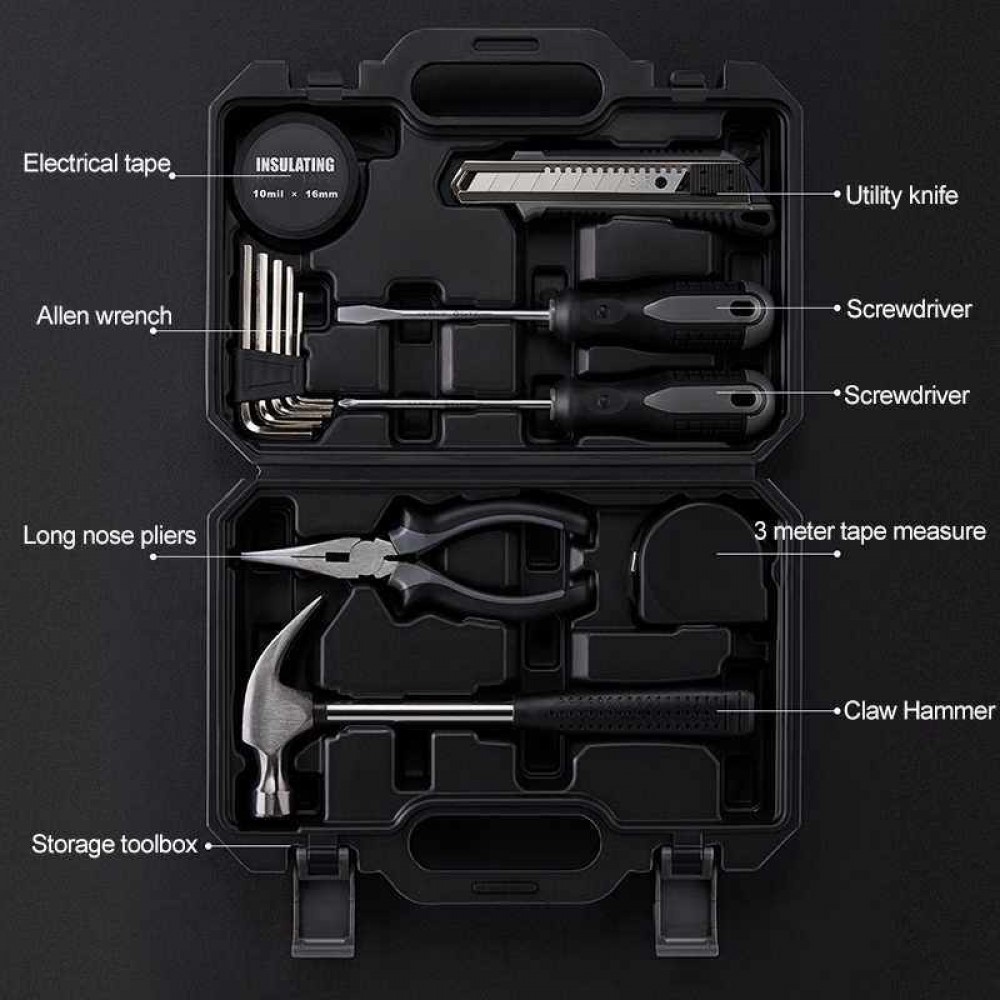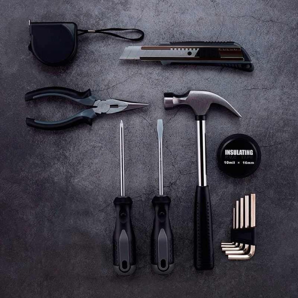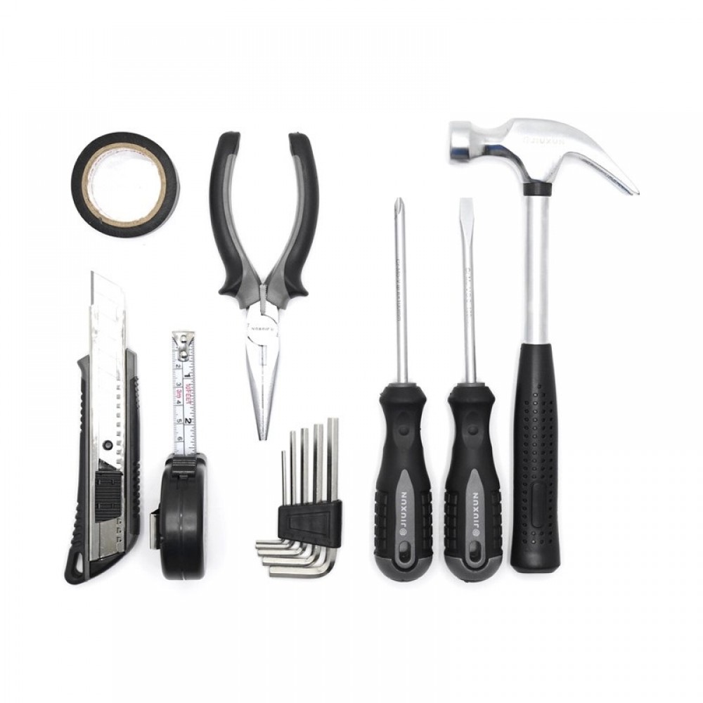 جعبه ابزار jiuxun برند زیر مجموعه شیائومی با ابعاد 73*203*276 میلی متر و وزن 1369 گرم از 12 ابزار مختلف بهره می برد که درون یک جعبه پلاستیکی با کیفیت قرار داده شده اند که شامل یک پیچ گوشتی دو سو، یک پیچ گوشتی چهار سو ، چکش با یک سری میخ کش ، کاتر، دم باریک و یک متر (3 متری) و پنج عدد آچار آلن می باشد؛ که کابران می توانند با تهیه این پک ابزار تقریبا خیلی از نیاز های خود را پوشش دهند.البته اشاره به این نکته نیز حائز اهمیت است که در قسمت درب کیف این محصول یک مکان جهت قرار گیری پسب برق می باشد که البته لازم به ذکر است که خود این کالا دارای یک عدد چسب برق نیز می باشد.