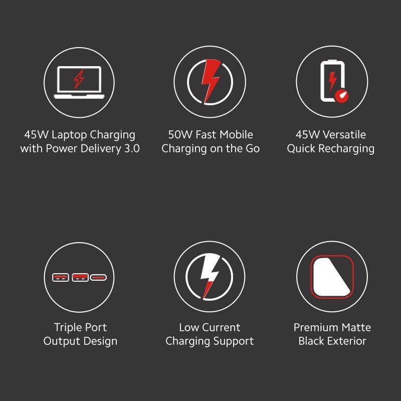 شدت جریان و ولتاژ خروجیاستفاده همزمان از سه درگاه: 5V/4A , 9V/3A , 10V/5A , 12V/3A , 15V/3A , 20V/2A , درگاه Type-C نیز به این نحو : 5V/3A , 9V/3A , 10V/5A , 12V/3A , 15V/3A , 20V/2A , درگاه USB-A به صورت تکی: 5V/3A , 9V/2.23A , 12V/1.67A , 10V/2.25A MAX , درگاه های USB-A در صورت استفاده همزمان از هر دو: 5V/3A