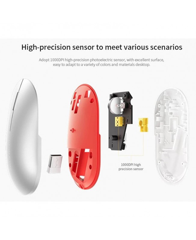 ماوس وایرلس شیائومی با پشتیبانی از فرکانس 2.4 گیگاهرتزی و حساسیت 1000 dpi توانایی عملکرد رضایت بخش در تمام سطوح را دارد و می تواند علاوه بر پد مخصوص ماوس در مکان های دیگر نیز مورد استفاده قرار بگیرد ،طراحی بدنه آن نیز به شکل ساده و مینیمال و از مواد اولیه پلاستیک ABS + PC می باشد که با وزنی سبک خود به راحتی می توان آن را حمل و جابجا کرد.همچنین منبع تغذیه انرژی این ماوس یک باتری قلمی AA می باشد که توسط شرکت سازنده درون محصول نیز قرار داده شده و برای اتصال آن به دستگاه های مختلف نیز می توان از دو روش استفاده کرد ، روش اول استفاده از دانگل USB می باشد و روش دوم به کمک فناوری بلوتوث است ؛ البته باید توجه داشته باشید که برای دسترسی به باتری و دانگل این ماوس باید قسمت رویی آن را که به صورت آهنربایی است جدا کنید و برای استفاده از حداکثر حساسیت و بلوتوث نیز می توانید کلید های فیزیکی که در قسمت زیر آن تعبیه شده مورد استفاده قرار دهید.