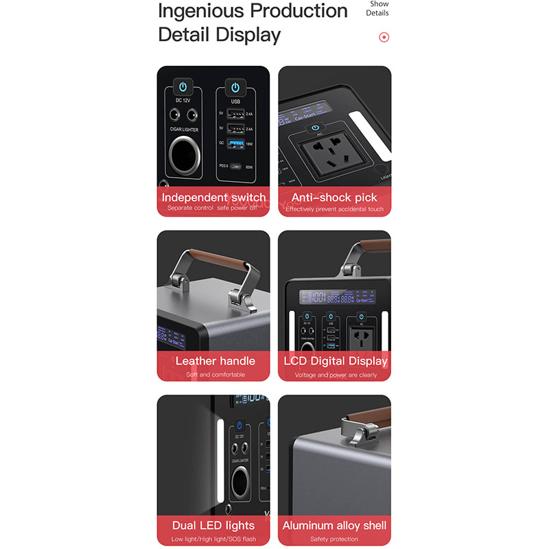 en500 از یک LED مستطیل شکل در قسمت جلویی خود بهره می برد تا بتواند مقدار شارژ دستگاه ، توان خروجی و ورودی ، دما و بازه فرکانسی را برای کاربران نشان می دهد و از طرفی هم همان طور که گفته شده از مواد با کیفیت به همراه یک دستگیره پلاستیکی که دارای یک قسمت چرمی برای حمل راحت تر است ساخته شده تا بتوان آن را به راحتی جابجا کرد و از توان 500Wh آن استفاده نمایند. اما نکته ای مهم از ویژگی های این محصول وجود چراغ تقریبا پر نور خطی در قسمت جلویی آن است که در همان مکان ها کلید فیزیکی برای روشن شدن آنها تعبیه شده و می توان از این محصول به عنوان چراغ قوه نیز استفاده کرد.