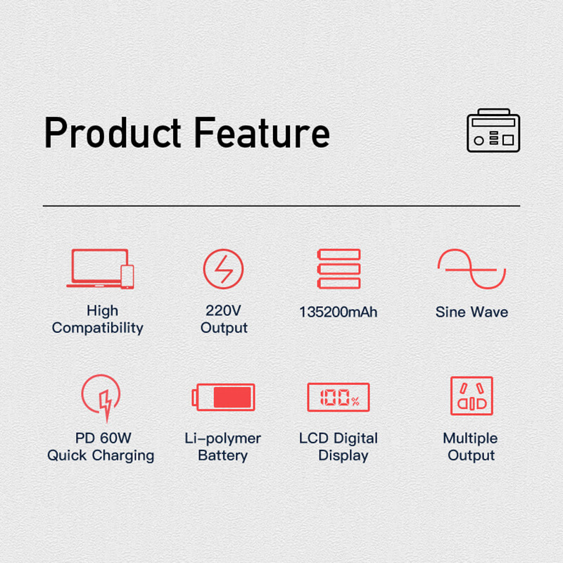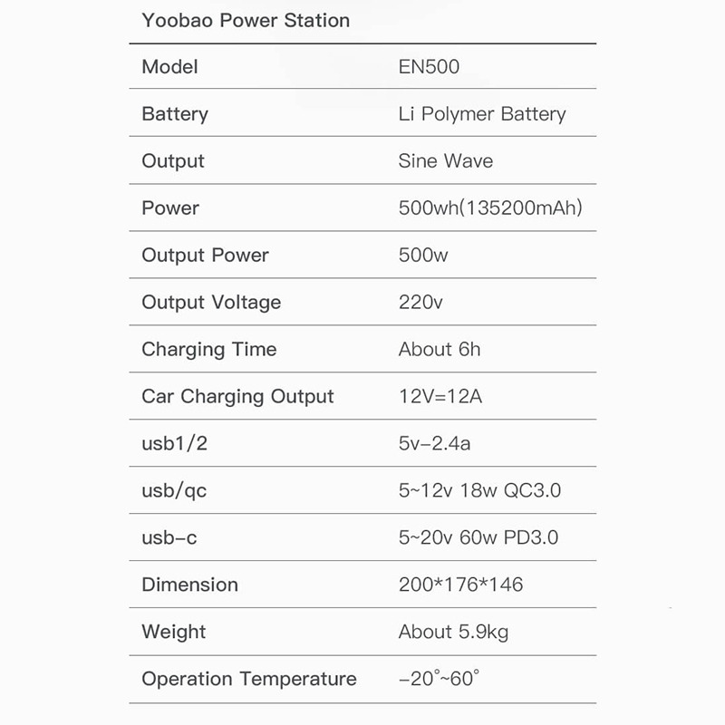 این پاوربانک با ابعاد 146*176*200 میلی متر ، وزن 5.9 کیلوگرم و توان کلی 500 وات از جنس پلاستیک ABS با کیفیت و مقاوم ساخته شده تا کاربران بتوانند علاوه بر حمل راحت این پاوربانک از آن در همه شرایط استفاده کنند و نگران آسیب رسیدن به آن نباشند ؛ اگر بخواهیم درباره کارایی هایی که این محصول نیز صحبت کنیم باید بگوییم که EN500 با بهره مندی از یک باتری 135200 میلی آمپر ساعتی توانایی شارژ همزان 7 دستگاه متصل به خود را دارد به این شکل در قسمت جلویی این محصول 3 پورت USB ( یک عدد از این ورودی ها از فناوری QC3.0 پشتیبانی می کنند) در کنار یک خروجی تایپ سی (با حداکثر توان 60 وات) ، یک خروجی AC ، یک سوکت فندکی خودرو به همراه یک خروجی DC 5.5mm (با حداکثر ولتاژ 12 ولت) قرار داده شده است، همچنین اشاره به این نکات هم حائز اهمیت است که در بالای هر قسمت یک کلید زیبا طراحی شده و در مواقعی که از هر خروجی قصد استفاده را دارید باید کلید تعبیه شده در بالای آن را فشار دهید تا جریان متصل شود.